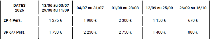 Tarifs par appartement et par séjour de 7 nuits