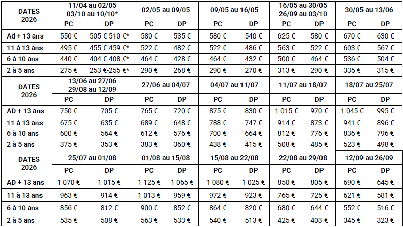 Tarifs par personne et par séjour de 7 nuits